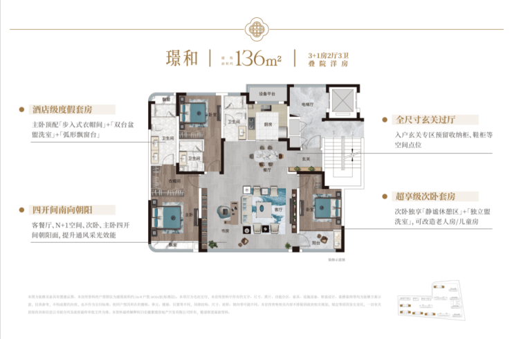 135㎡四房两厅两卫户型为项目压轴之作,LDK一体化客餐厅,面宽达6.6米,营造开阔社交空间;双主卧套房配置,兼顾父母与主人的居住尊严;南向双阳台可分别打造为生活阳台与景观阳台,功能分区明确。所有户型均采用绿城高标准精装交付,选用方太厨电、摩恩龙头、圣象地板、多乐士环保涂料等一线品牌,细节之处尽显匠心。户型设计充分考虑家庭成长性,灵活可变,真正实现“一步到位”的置业理想。