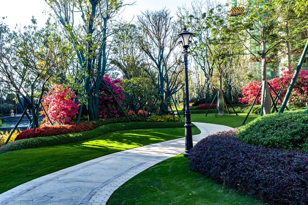 社区内建筑周围以草木自然合围,品种及颜色的变化多样,达成景观丰富层次感;入口广场错跃设计,形成标志性景观;园区小路曲折蜿蜒,配以错落的围合树池,让人身处绿色花园中;主题邻里交流空间,灌木闭合,功能与内容之间达成过渡,景观更立体。