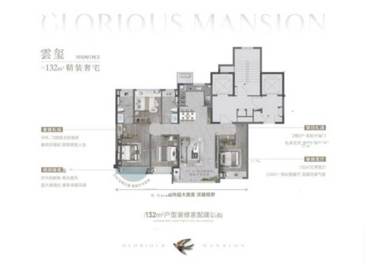 龙湖亚伦璟云上府项目还推出了143㎡的四室两厅两卫户型。该户型采用LDKG一体化设计,餐客阳台无界融合,打造流畅的居家动线,为居住者提供更多的共享空间。约11.3米南向超大面宽,双卧朝南,采光通风俱佳。主卧套房设计中配备南向飘窗、独卫、双衣帽柜,为居住者打造了更为便捷、私密的居住环境。