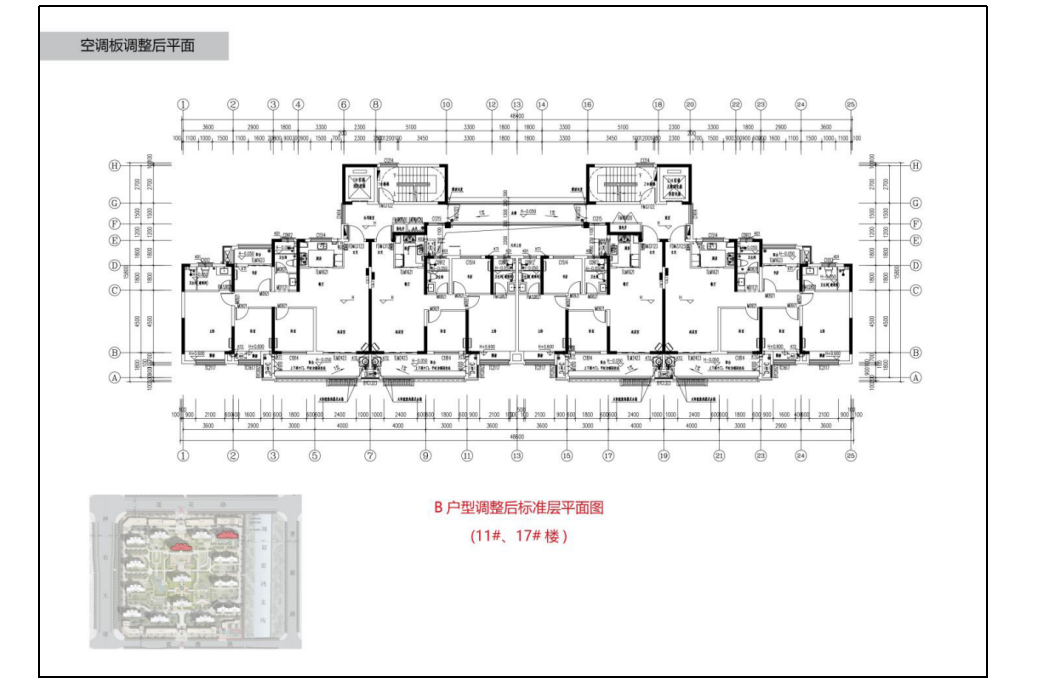 2、高层住宅天井处空调机位调整。原设计不满足消防规范,经专家论证后调整至天井两侧。