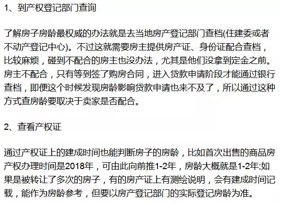 既然房龄高的二手房有这些问题,该如何判断房子的房龄呢?民用住宅使用年限是70年,不少人认为自己能使用70年,其实则不然,房龄并不是从你拿到房子的那一刻算起的,而且是从房子建成验收合格交付使用时算起,这点需要注意。房龄可以通过以下几种方式查询: