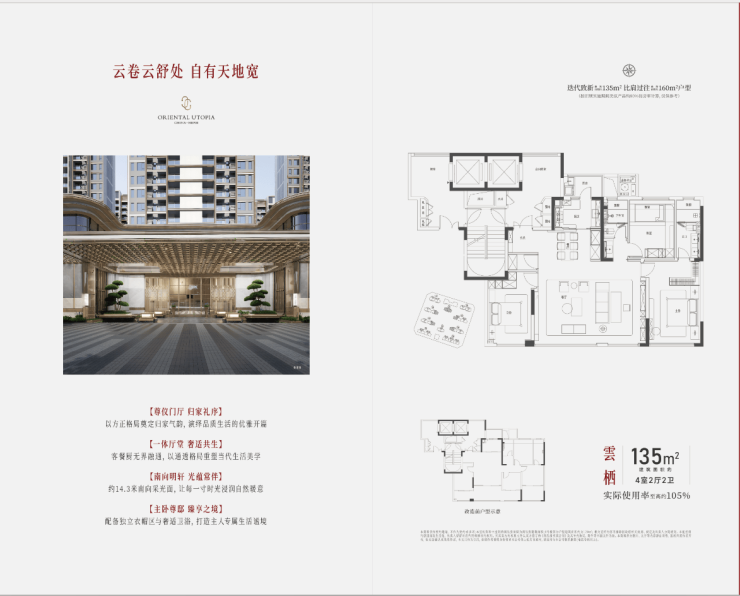 142㎡阔绰四居是项目的顶级户型,采用横厅设计,客厅面宽达 5.6 米,搭配全景落地窗,采光与视野效果极佳,营造出奢华大气的居住氛围;主卧套房空间宽敞,面积约 26㎡,包含独立卫浴、步入式衣帽间与观景飘窗,独立卫浴配备双台盆、浴缸与淋浴区,尽显主人身份与格调;两个南向次卧均配备观景飘窗,采光充足,面积约 12.5㎡与 11.5㎡,居住舒适度高;北向次卧可灵活改造成书房、儿童房或客房,适配家庭不同阶段的需求;客餐厅与厨房形成开阔的公共活动空间,总面积约 32㎡,搭配阳台的休闲区域,打造出兼具社交与休闲功能的生活场景;同层排水设计,避免了楼上楼下排水噪音干扰,提升居住静谧性;全屋采用精装修交付(可选),装修标准包含品牌地砖、墙面乳胶漆、品牌卫浴、品牌厨具、全屋新风系统等,品质有保障;智能门锁、全屋智能控制系统等配置,让居住更加便捷高效。