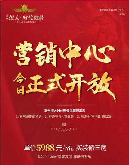 疫情当前,人心惶惶。亳州恒大时代御景也在1月底临时关闭了营销中心,改为线上实景看房。为了能给大家提供更好的服务,现于今日重新开放营销中心,欢迎大家莅临看房。同时也温馨提示大家:看房前请先行预约,日常生活请杜绝聚集性活动,勤洗手,出门戴口罩,注意消毒和卫生。不便之处敬请谅解,也希望祖国早日度过难关。