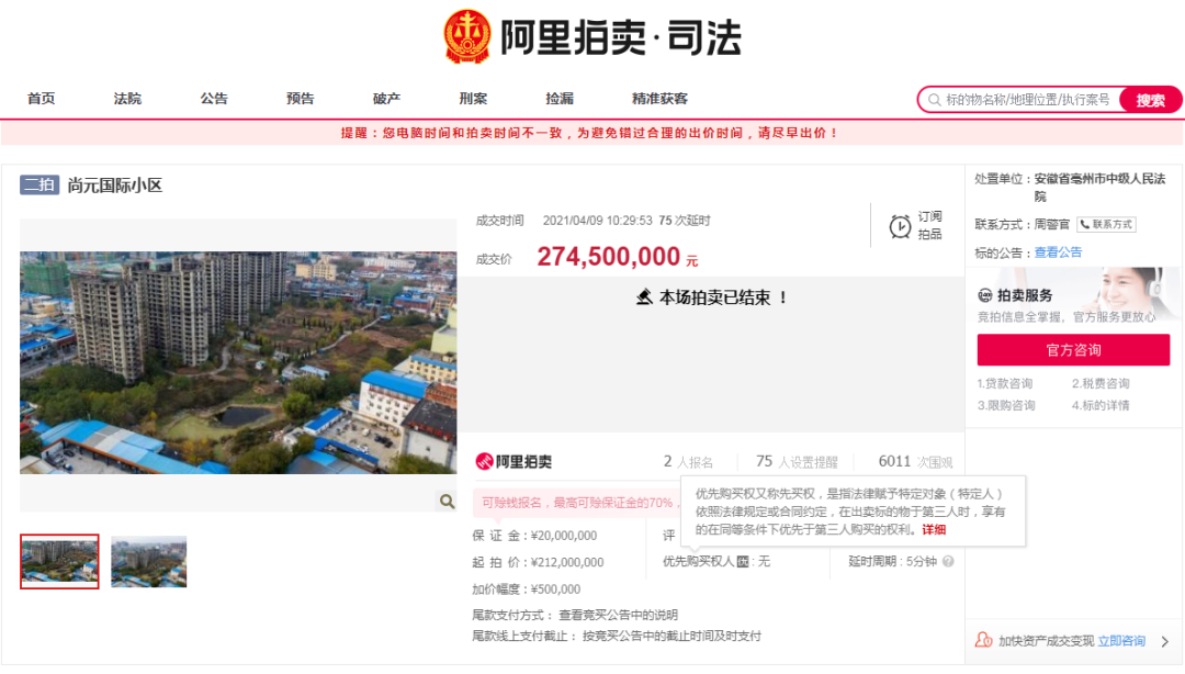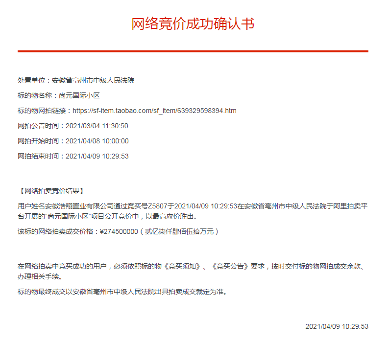 根据安徽省亳州市中级人民法院4月9日公示,我市谯城区尚元国际小区于网络竞价中拍卖成功,竞得人为安徽浩翔置业有限公司,成交总价达274500000元。