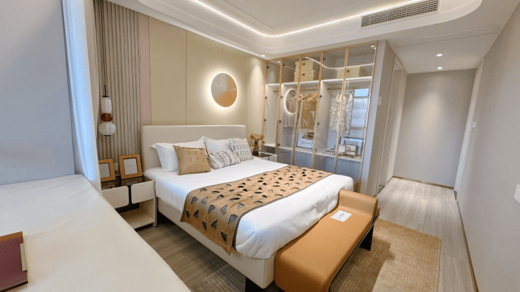 125㎡四房户型堪称“全能选手”,LDK一体化设计增强家庭互动,主卧套房配置步入式衣帽间,双卫设计避免早晚高峰拥堵,多功能房可作儿童房、书房或电竞房,满足多元生活场景。143㎡大平层则面向高端改善客群,6.5米横厅、全景落地窗、双主卧套房设计,尽显奢阔气度。每一户均配备品牌厨电预留位、防滑地砖、静音排水管等细节,真正实现“所见即所得”的品质交付。