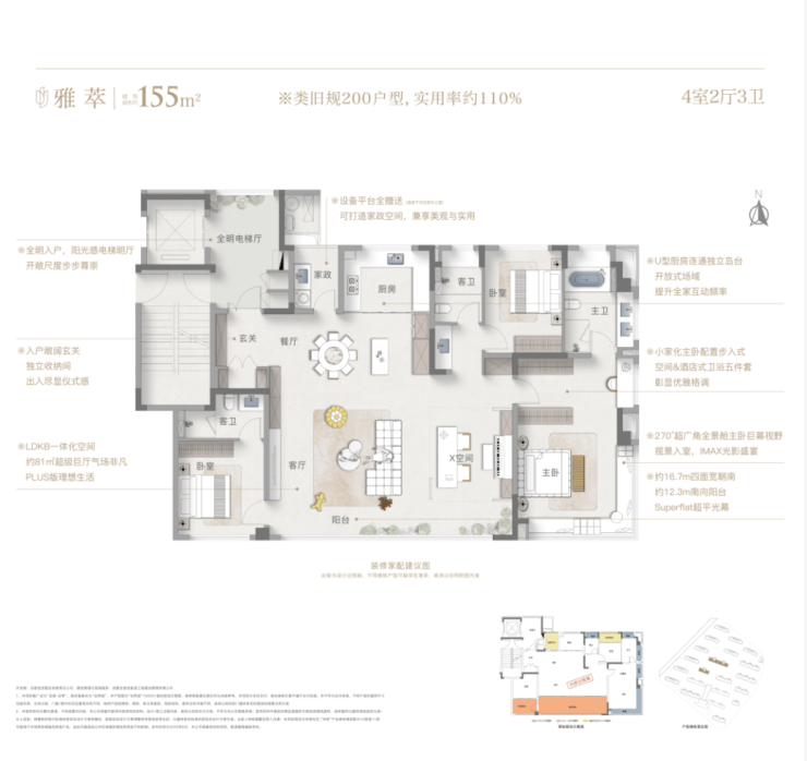 建筑面积约 135 平方米的四室两厅两卫户型,是终极改善的优选,实景空间阔绰,功能完善。户型实景采用大横厅设计,客厅面宽 5.2 米,与南向超大阳台相连,阳台面宽 5.2 米、进深 2.2 米,空间感十足,家庭聚会、朋友宴请均可轻松容纳。四开间朝南,采光面宽达 14.8 米,客厅、主卧、两个次卧均朝南,实景每个房间都能享受充足阳光。主卧套房设计,面宽 3.9 米,配备独立卫生间、超大衣帽间与全景飘窗,居住舒适度极高;两个南向次卧面宽分别为 3.4 米和 3.2 米,可作为儿童房或长辈房;北侧次卧面宽 3.1 米,可改造成书房、健身房或客房。厨房 U 型设计,操作空间宽敞,预留双开门冰箱位置;公共卫生间干湿分离,布局合理。该户型实景现房呈现,空间阔绰,功能完备,品质有保障,能够满足大家庭的居住需求,是改善型购房的稳妥之选。