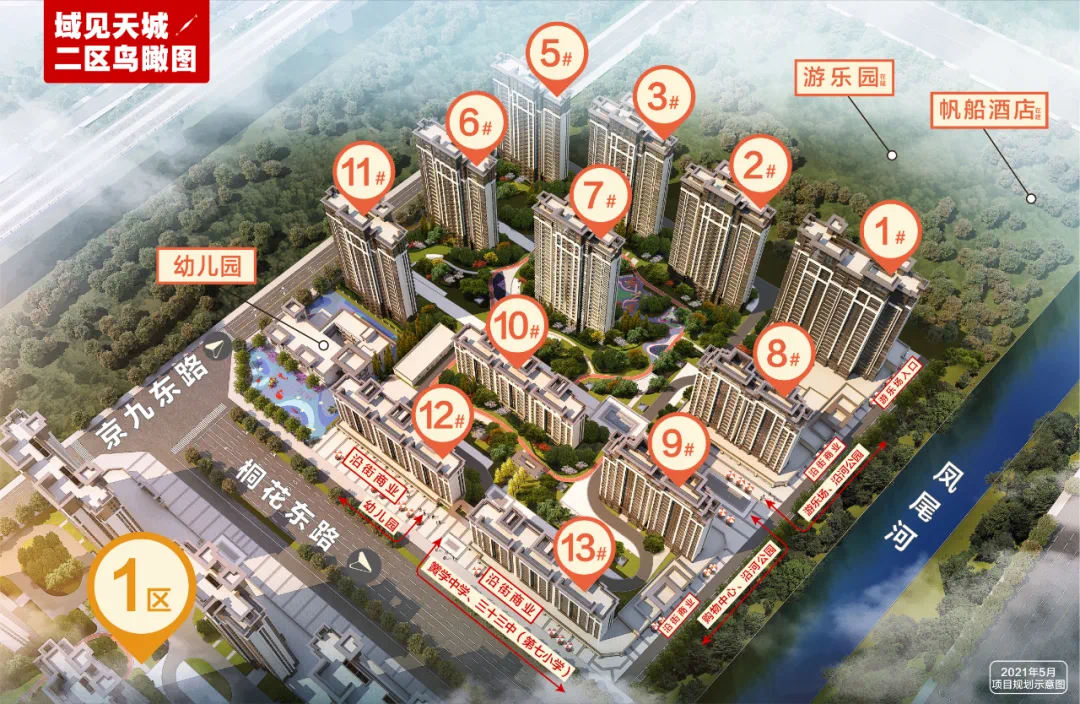 环顾室内,全系淡雅色调的窗帘、沙发、餐桌更增添了室内亮度,南向双卧汲取了更多阳光的照射,使得屋内一片清明和暖意。由阳台向东望去,凤尾河两岸依然绿意盎然,各类草木绵延数里,水面闪烁着星河一般的阳光。视线越过河面再向东去,可以看到一条路口之隔的黉学中学和三十三中校园红色的围墙。