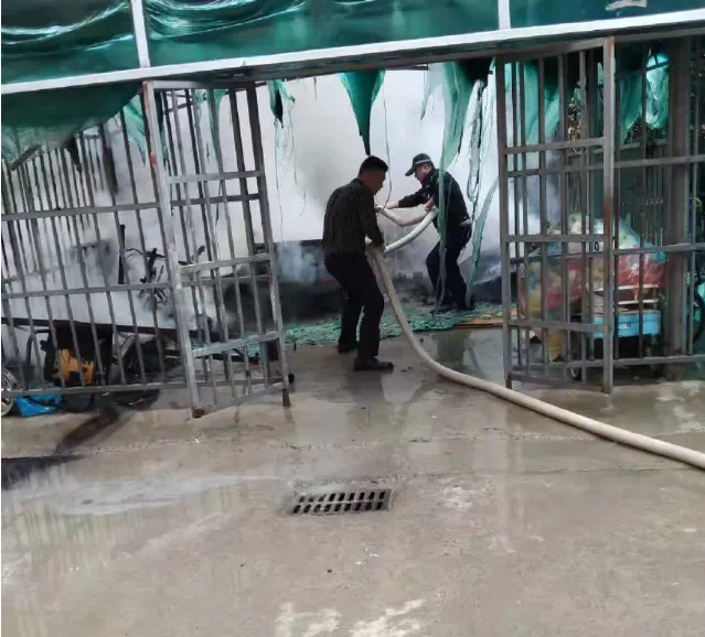 民警跑到失火现场后,发现是一停车棚起火,现场浓烟滚滚,旁边就是居民户,情况危急。