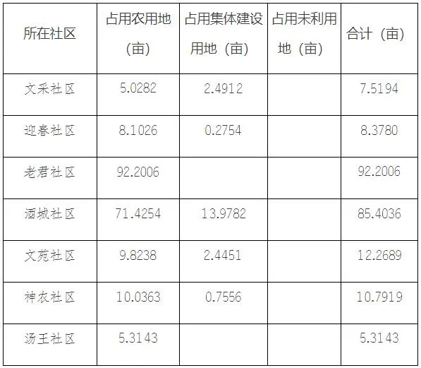 拟征收高新技术产业开发区文采社区土地7.5194亩迎春社区土地8.3780亩老君社区土地92.2006亩酒城社区土地85.4036亩文苑社区土地12.2689亩神农社区土地10.7917亩汤王社区土地5.3143亩
